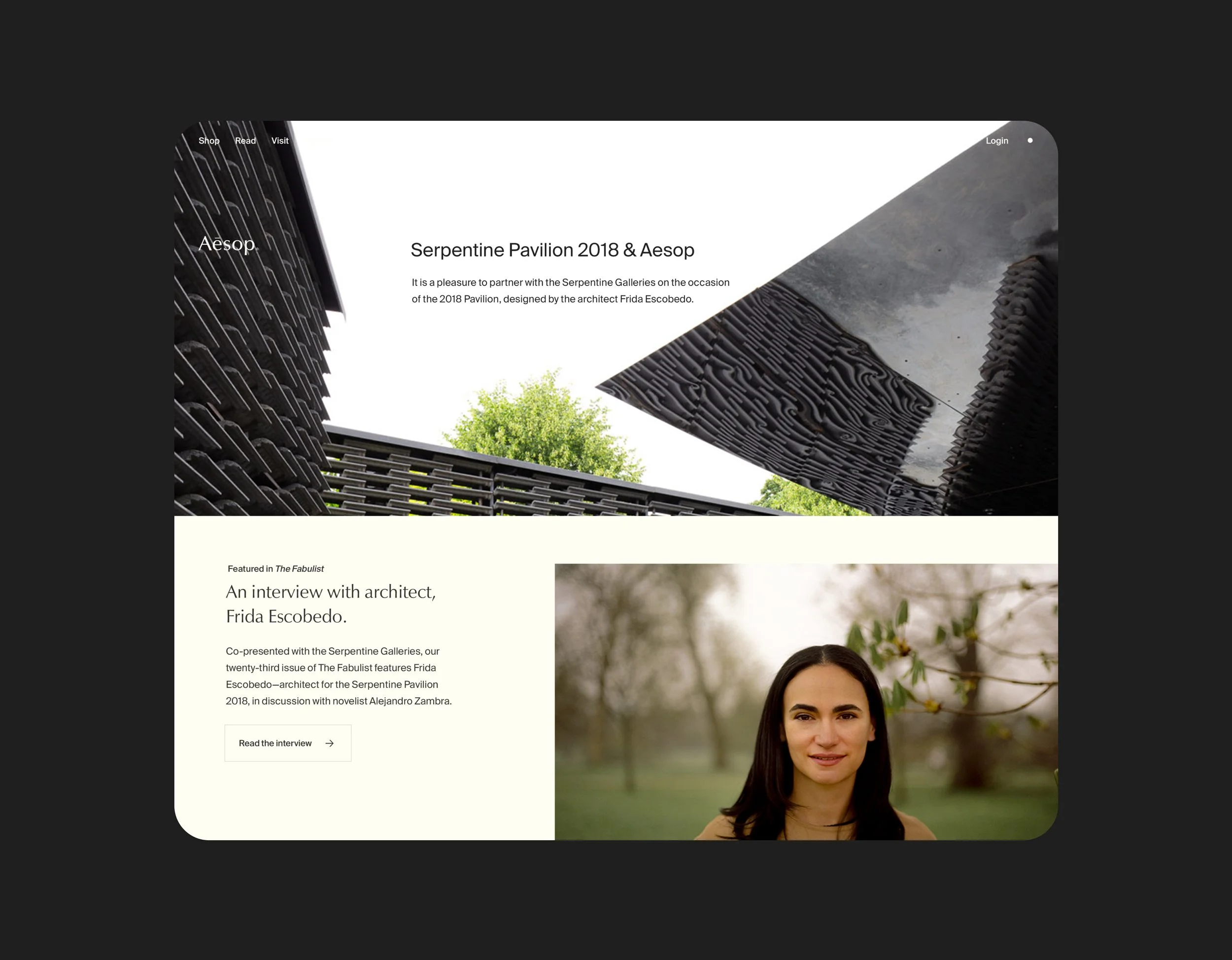 On the occasion of the Serpentine Pavilion 2018, Aesop partnered with the Serpentine Galleries to explore the architectural design by Frida Escobedo.